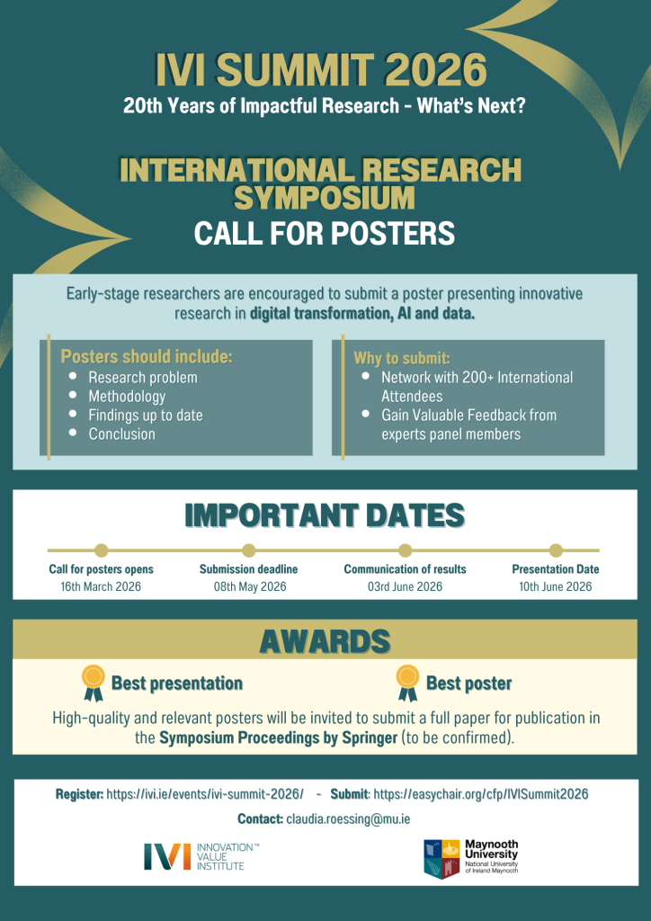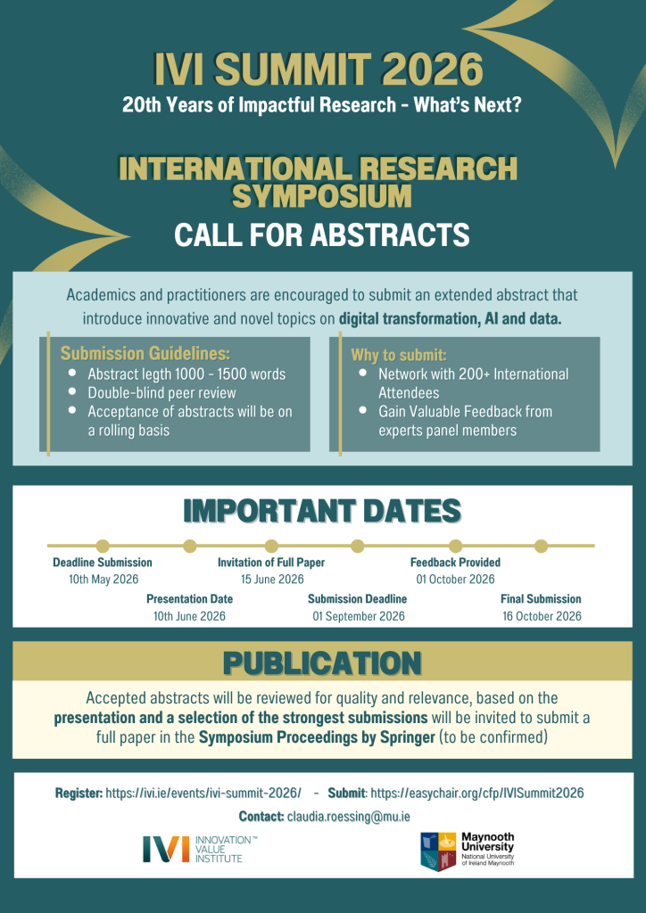 As part of the IVI Summit 2026, taking place from 10th to 12th June, the Innovation Value Institute invites contributions that address challenges around Digital Transformation, AI and Data. We seek contributions from emerging researchers (Academics and Researchers), established academics, and industry practitioners that advance innovation on Digital and Data through both theoretically grounded and practice-oriented insights. We particularly encourage contributions that are co-authored in collaboration between academia and non-academic sector in an international context. Equally important, we welcome submissions that introduce innovative and novel topics on Digital Transformation, AI and Data, offering fresh perspectives and creative approaches to address emerging challenges. The Symposium will bring together a dynamic community of scholars and professionals to exchange ideas across diverse research areas, fostering dialogue that bridges disciplines, methods, and perspectives.